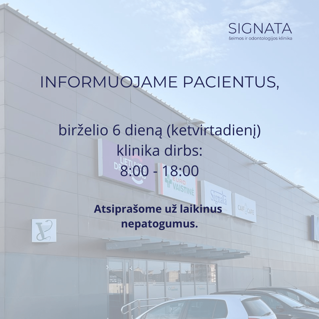 Birželio 6 dieną (ketvirtadienį) klinika dirbs: 8:00 - 18:00